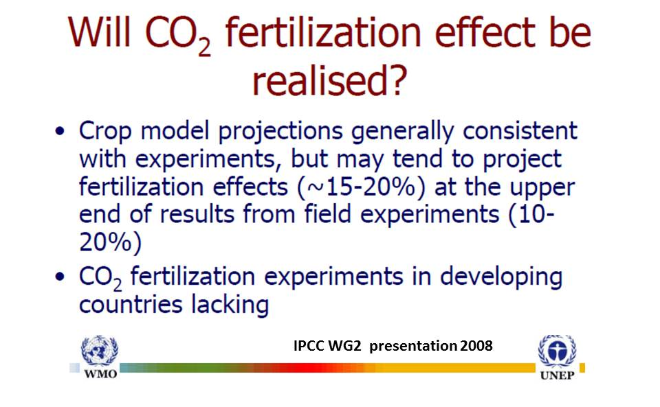The scientists think that the CO2 fertilization positive effect from experiments in artificial environments are over estimates of the real world benefits for agriculture. Even so the IPCC climate crop models are based on CO2 research lab benefits.