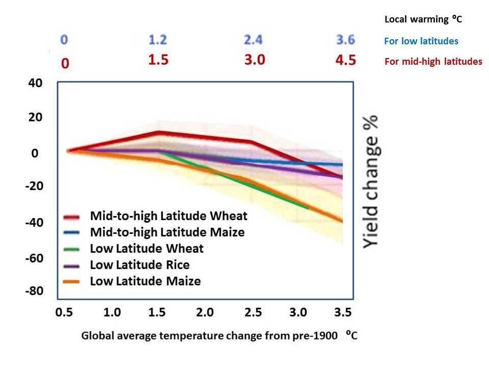 Global crop yield is at risk of decline at a global temperature increase of 1.5°C and
